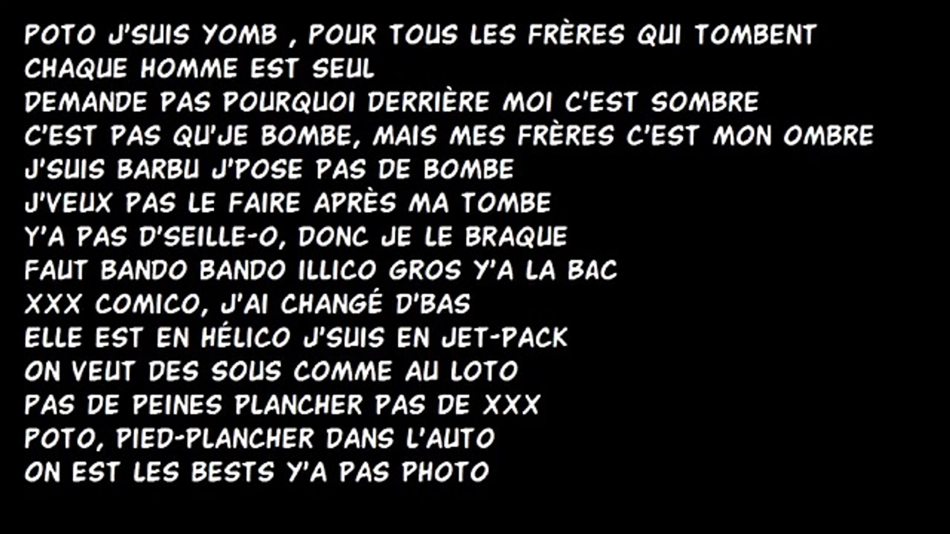 Zifukoro de la beuh Violent oui Mets le volume dans le casque man Ouais sale Jsuis violent comme sud de lItalie. Il aime samuser son bendo. Tiens vas-y prends un calmant Poto jsuis yomb Pour tous les frères qui tombent Jamais seul Demande pas pourquoi derrière moi cest sombre Cest pas quje bombe Mais mes frères cest mon ombre Jsuis barbu jpose pas de bombe Jveux pas l.